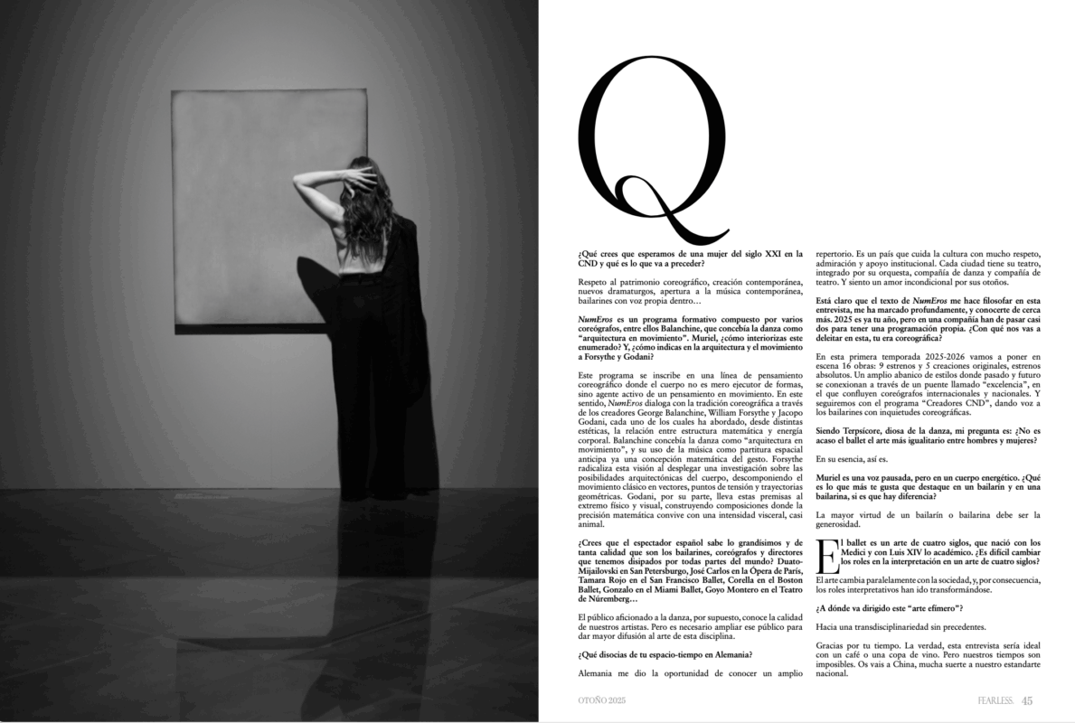 Septiembre no solo es el mes más importante para diversas cabeceras de revista, sino también el inicio de nuevos ciclos (económicos, políticos y sociales). Esteaño celebramos el comienzo de la dirección artística de MURIEL ROMERO al frente de la Compañía Nacional de Danza (CND), institución creada en 1979 de la mano del duque consorte de Alba, Jesús Aguirre. Y lo hacemos junto a ella desde el Museo Universidad de Navarra, obra del arquitecto Rafel Moneo.